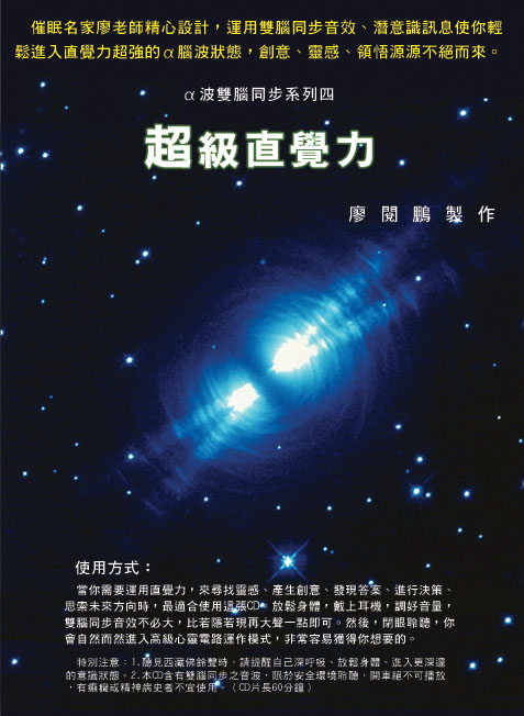 催眠名家廖老师精心设计,运用双脑同步音效、潜意识讯息,使你轻松进入直觉力超强的α脑波状态,让创意、灵感、领悟,源源不绝而来。