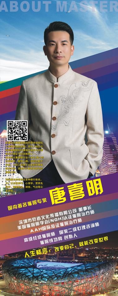 导师:唐喜明 AAH和NGH国际授证催眠治疗师,高级经络催眠师,国家二级心理咨询师,著名催眠专家,获得AAH美国催眠治疗师学会授权之催眠训练师资格,是华人地区少数能够教授AAH课程及颁发AAH催眠治疗师证书的训练师之一。 唐老师从事催眠行业十余年,潜心研究催眠术,颇有心得。并研修过多种修行体系,同时广泛涉猎佛学、心理学、营养免疫学、健康养生、睡眠、禅修、气功等众多领域。在中国大陆开办专业的高效催眠师训练课程数十期,培训过数千学员,培养了众多的优秀催眠师,获得很好的声益。